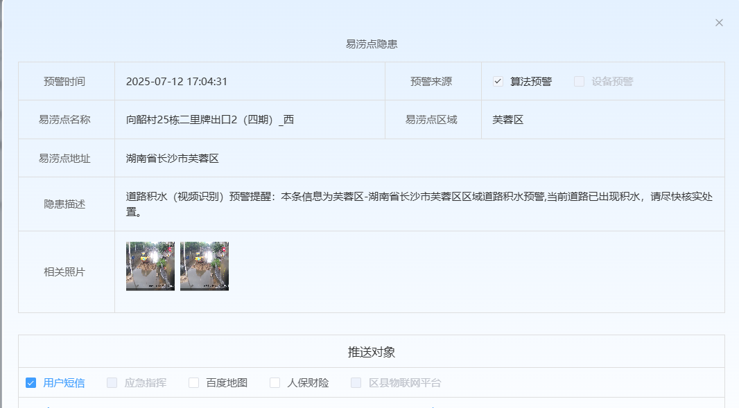 (2)进一步强化了防汛感知监测和智能预警能力。一是数据融合,密织全域感知“神经元”。以 “一屏统览”重塑防汛预警场景,整合336条城市道路、31个桥梁涵洞、8个倒灌小区等历史易涝点,以及300 座重点水库、38个堤垸数据,关联周边1126路实时视频与749个感知设备,逐点位配置智能算法,实时捕捉内涝隐患与水位波动,实现防汛数据要素“一网归集”。二是智能预警,跑出应急响应“加速度”。突破传统人工巡查模式,启用 “防汛预警发布 + 积水算法启动” 智能机制,融合气象预报、易涝点监测等多维数据,重点在夜间精准及时预报城市内涝,定位风险区域。自场景上线以来,已核准防汛预警16条,通过交警群发布处置指令16条、通报应急部门处置16次,实现风险隐患“秒级响应、高效处置”,防汛效率显著提升。三是拓展场景,激活实时预警 “新形态”。实现预警精准触达,预警信息经应急确认后,定向推送至积水点周边3公里范围内手机用户。多路段积水超10厘米时,向市民发出短信预警提醒,让群众提前做好防范准备。四是惠民利企,打造社会应用 “新范式”。拓展防汛预警社会化场景应用,实现与百度地图深度联动,通过地图导航实时发布城市内涝信息,引导市民避让内涝点;携手中国人保长沙分公司推进“车辆涉水救援与理赔佐证场景政务数据授权运营”落地,实现政务服务与社会应用深度融合。
