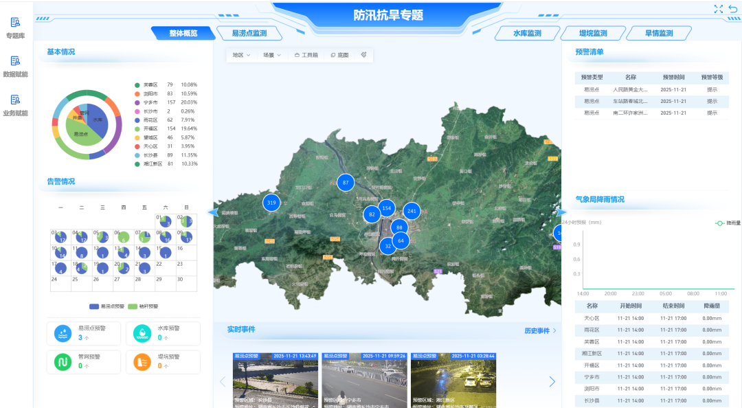 防汛抗旱专题功能建设是在城域物联网管理平台基础能力和数据基础之上,结合长沙市城市基础设施亮点,融合应急、水利、人保等相关部门业务需求,充分发挥全市视频云已经接入33万路摄像头及视觉算法平台优势作用,治理分析防汛抗旱相关跨部门城市部件及感知数据资源,以内涝监测、水库监测、河道监测、旱情监测等专题数据供应的方式建设专题指挥功能大屏。