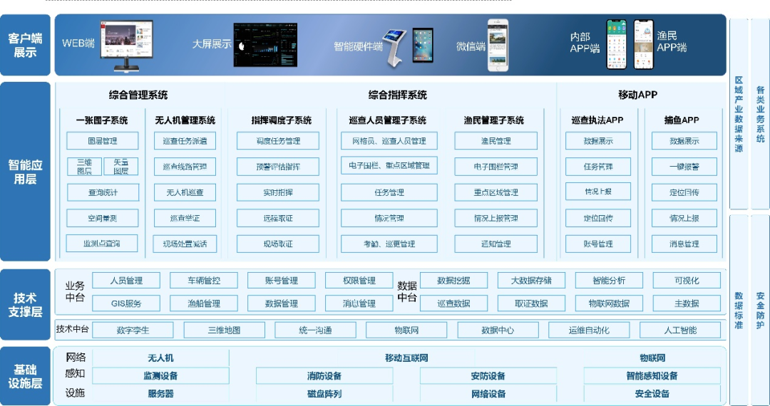 针对移动端与桌面端数据孤岛问题,提出多端一体化协同感知架构。通过构建双平台无缝对接的“一张图”系统,实现PC端与移动APP(Harmony OS/Android/iOS)的指令同步与数据融合;设计巡查人员与渔民的双向信息交互协议,支持实时数据采集、数据回传与预警实时推送,形成“人-机-云”闭环反馈链路,人员平均通信时间由3分钟缩短至5秒。