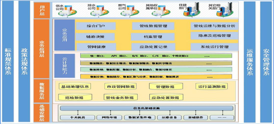 基于管网数据库和业务应用系统, 实现外业数据采集、数据建库管理、三维管线建模、智慧感知和智能监测,提供数据管理、工程管理、档案管理、数据共享、运行监测、隐患管理等决策支持服务。