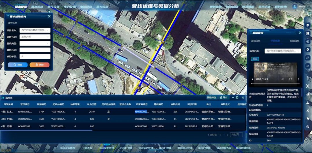 西宁市开展排水管网全面检测工作时,管线运维与数据分析子系统发挥核心作用:通过多源查询功能快速筛查腐蚀、破损、沉积等各类缺陷点,利用多维统计功能按缺陷类型、分布区域、严重程度完成分类汇总,自动生成可视化分析报告。系统同步挂接检测过程中的视频、图像等原始资料,权属部门可一键调取核验缺陷实况,精准制定整改方案;整改完成后,将新的检测数据与原始档案对比更新,形成“筛查-统计-分析-整改-核验”的全流程闭环,让管网缺陷治理有迹可循、有据可依,大幅提升整改针对性与工作效率。
