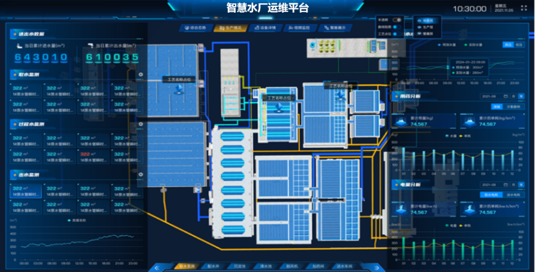 将水厂构筑物、工艺管线、设备设施、仪表阀门等实体要素进行数字化建模,形成与物理水厂实时对应的数字孪生体,实现水厂运行状态集中展示。
