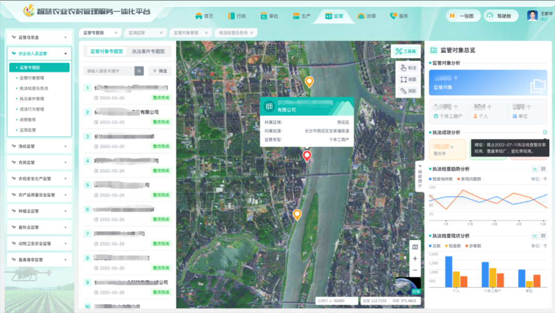 面向全局所有执法类业务,包括渔政渔业监管、农机安全监管、农业投入品监管、农产品质量安全监管、种植业监管、屠宰管理监管、农房监管等,将农业违法事件建立网格化农业执法一本账,并以网格为单元,整合成全市农业综合行政执法一张图,实现全局执法业务的统一管理和各类违法事件的全流程管控。