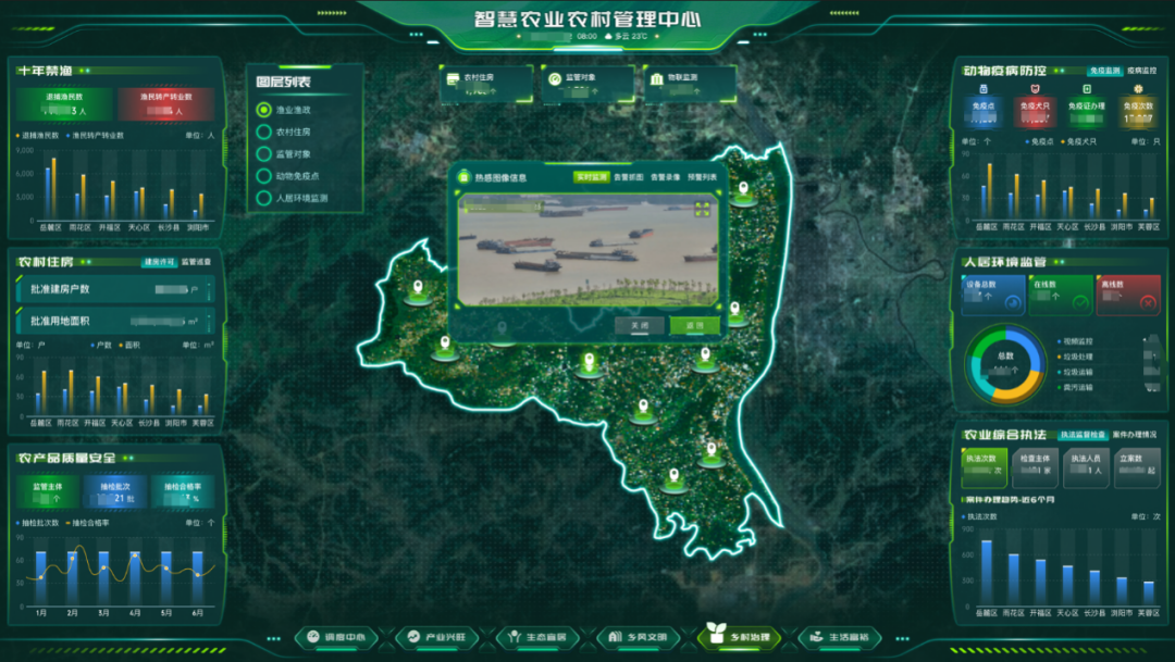 根据乡村振兴评价规范,结合农业农村业务需求,对乡村振兴工作进行全面梳理,以大数据挖掘为手段,对智慧农业农村产业、生态、乡风、治理、生活等五个方面工作的重点管理,深化农业农村领域分析决策能力,实现全局关键指标及监测数据“一屏统筹”,辅助决策者随时了解全市农业农村家底情况,支持查看现场视频并进行指挥调度。
