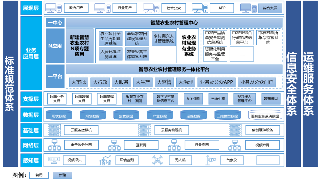 面向新时期农业农村职能部门的新需求,通过“统一门户、统一用户、逻辑互联、数据互通”,汇聚“图、文、卷、会、档、证”等不同业务、不同维度的农业管理资源,通过信息化手段搭建定制化的“一图、一中心、一平台、N应用”,推动农业农村业务融合与效能聚合,实现涉农事项业务生态和信息生态的“全生命周期”协同管理。