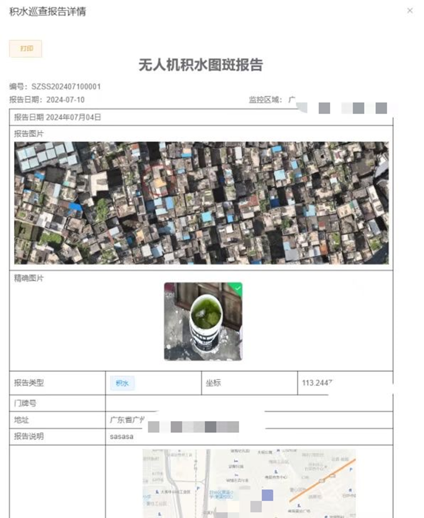 报告自动生成:云端 AI 平台对回传影像完成分析后,自动生成含隐患 GPS 坐标、地址、图片、类型等信息的积水巡查报告(如图5所示),无需人工干预,确保数据记录的标准化与精准性;