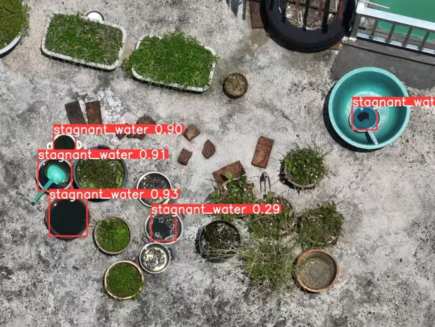 智能识别算法:平台搭载针对蚊媒孳生地的专属识别模型,可精准识别花盆、泡沫箱、积水三类核心目标物(如图4所示),识别准确率达 85% 以上。飞行过程中,边缘计算模块同步对采集图像进行预处理,裁剪无效数据、标注疑似隐患,使数据传输量减少 60%,避免云端处理延迟;