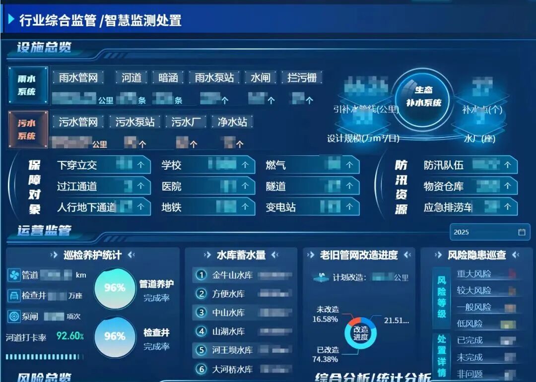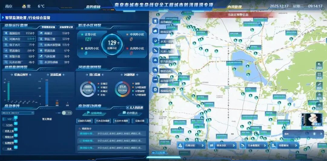 本项目立足南京实际,以业务需求为导向,充分依托大数据局资源与既有信息化基础,融合应用5G、大数据、物联网、GIS等先进技术,全面汇聚并分析河道、泵站、管网、污水处理厂及相关监测设备等多元数据,建成全市统一的“城市内涝安全监管与智慧监测平台”。平台以排水设施数据库为支撑,围绕“综合感知、预报预警、智能调度、应急处置”四大核心功能,构建覆盖“智慧监测—内涝防控”全流程的管理体系,实现设施运行数据动态采集、风险实时预警与调度协同处置,显著提升城市排水设施管理的智能化与科学化水平,为城市防汛与安全运行提供有力支撑。