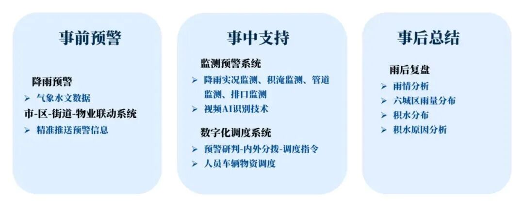 构建事前事中事后的全线管理流程(如图6所示),建成覆盖“事前预警-事中调度-事后复盘”的全周期内涝治理闭环。通过融合气象、感知设备、模型、公安122、政务12345等多渠道源数据,实现动态预警与风险预控;依托智能监测与联动机制,支撑应急调度与现场指挥;并结合大数据复盘分析,形成“一点一案”长效治理策略,系统提升城市防汛智慧化水平。
