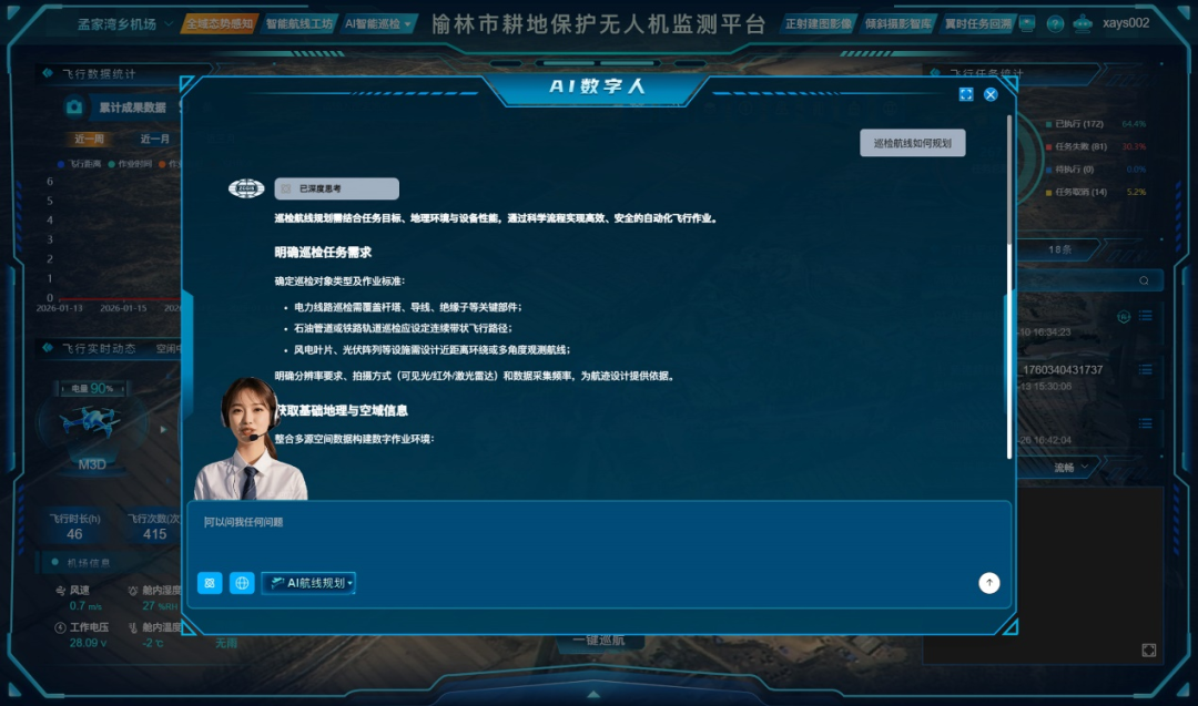 创新引入AI数字人作为智能交互中枢,整合智能问答、数据统计分析、AI航线规划三大核心功能,打破数据应用、疑问响应与路径规划间的信息壁垒。相较于传统平台的“操作繁琐、需专业技能”,实现“自然语言交互+端到端服务”,让基层监管人员无需专业培训即可完成航线规划、数据查询、问题咨询等操作,大幅提升业务处理效率。