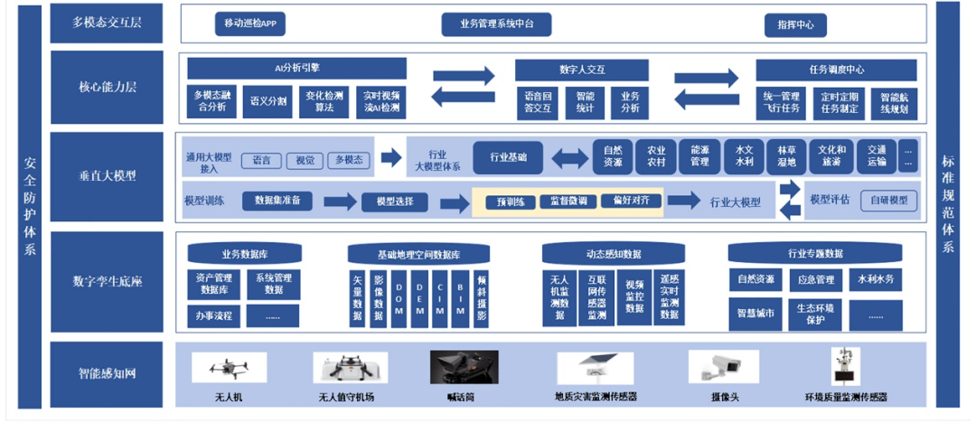 该架构是一个以智能感知网为基础,依托数字孪生底座与垂直大模型构建核心能力层,通过多模态交互层支撑移动巡检、业务管理与指挥调度等应用,并在安全防护体系与标准规范体系保障下的一体化行业智能平台架构。总体架构如图1所示。