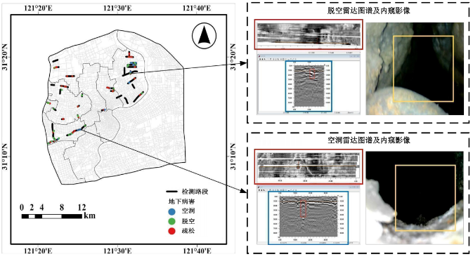 基于上海道路塌陷隐患评估结果——道路塌陷风险分布图,从上海市中心区域道路网络中选取了140个具有代表性的路段,总长度达42.6公里。其中76个路段被划分为极高或高隐患等级,总长度达28.6公里。随后,基于深度学习的3D GPR数据智能识别技术框架,开发了智能识别工具,对这些代表性路段的塌陷隐患进行了探测。图10展示了检测路段与塌陷隐患的分布位置,并呈现了两种典型地下病害的雷达图像与钻孔图像。在140个检测路段中,共发现53个路段存在101处地下病害,包括空洞、路面下空腔及松散填充空隙。在76个被评定为“极高”或“高”易感性的检测路段中,共识别出86处地下病害,分布于43个路段。其中地下空洞占比达22%,脱空占比28%,疏松占比48%。与传统钻探法相比,探测效率提升4-6倍,单条道路探测周期从7-10天缩短至1-2天;定位精度从米级跃升至0.3米以内,实现了病害体空间位置的精准锁定。同时,依托研发的病害体自动识别算法,对探地雷达回波数据的处理速度提升了3倍,识别准确率达92%以上,有效避免了人工判读的主观性误差。